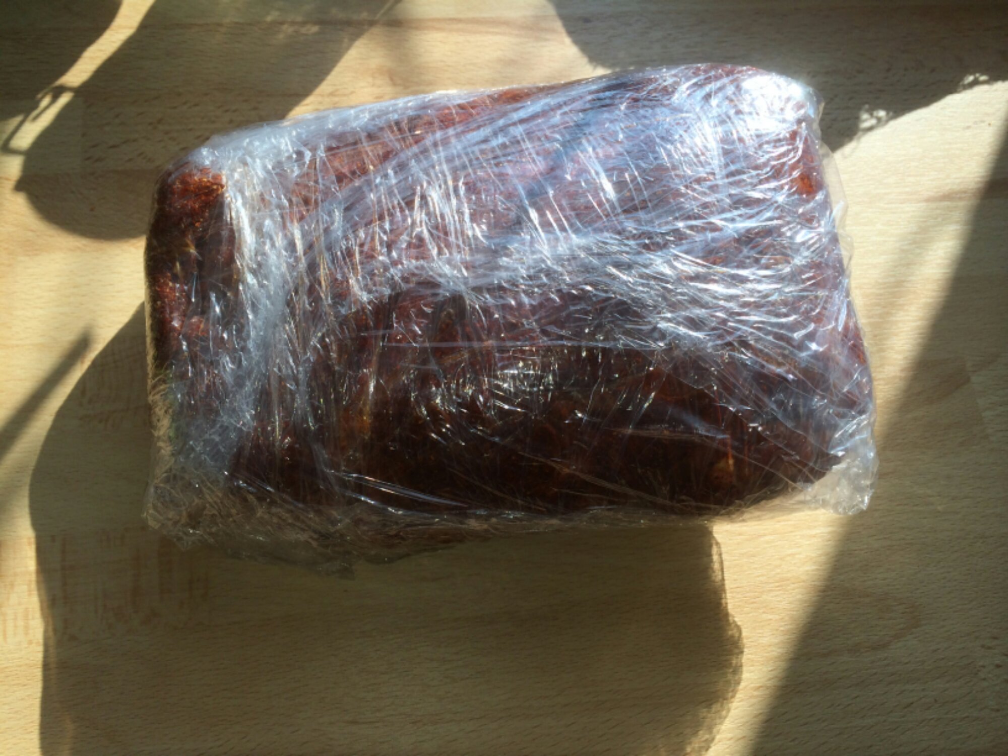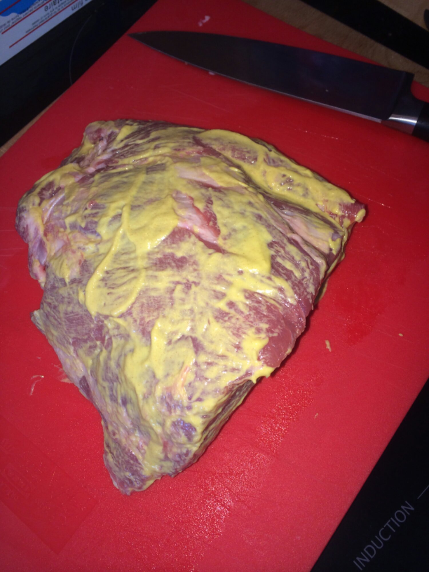 Kaum zu Hause angekommen begannen die Vorbereitungen für das kulinarische Erlebnis am nächsten Tag. Die Vorbereitungen im einzelnen waren zunächst das gute Tier zu teilen. Da es ja die Pulled Pork Premiere war/ist reichte erst einmal die gute hälfte. Also einen Teil verpackt und ab damit in den Tiefkühlschrank. Der andere Teil, dessen Lebenshöhepunkt kurz bevorstand, wurde gesäubert und abgetrocknet. Daraufhin bekam das Fleisch eine Massage mit Dijon Senf. Einerseits für den Geschmack und andererseits um dem darauf folgendem Rub besseren halt zu gewähren. Der Rub, eine trocken Gewürz Mischung, den ich benutzt habe nennt sich Magic Dust. Dieser soll nach meinen Internet Recherchen der beste Rub für Pulled Pork sein. Ob das Internet nun die wahrheit spricht wird sich in naher Zukunft zeigen. Nach dem rubben zog das Schweinchen zunächst in ein neues Kleid namens Frischhaltefolie. Hauteng verpackt ging es dann für ca. 15h in den Kühlschrank. Also nicht weit weg von seinem Zwilling eine Etage tiefer.