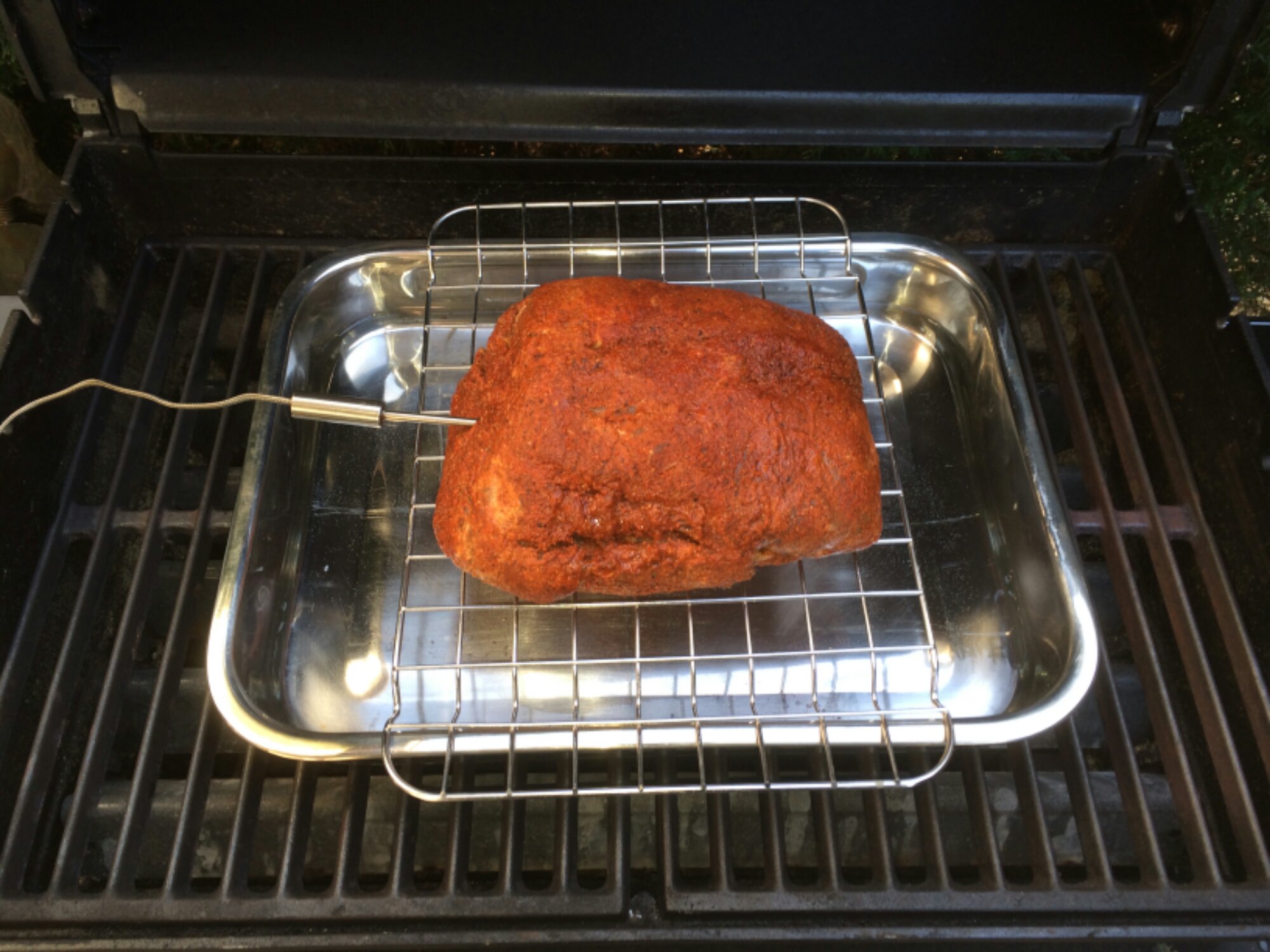 Die darauf folgende Nacht war lang und kurz zugleich. Also voller Vorfreude noch ab in den Baumarkt meines Vertrauens um noch etwas Futter für meinen Grill zu besorgen, sprich Gas. Sicher ist sicher. Zumindest wenn es um das Grillen geht. Nachdem ich die heimischen Gefilde wieder erreicht hatte, wurde das Schweinchen zumindest schon einmal aus dem Kühlschrank befreit. Ich gebe zu etwas früher wäre sicherlich besser gewesen. Aber so ist das nun mal wenn der Magen das Regiment übernimmt. Wie dem auch sei, raus auf die Terrasse und den Grill für Schweine angenehme 110-120 C° vorgeheitzt. Als Bettchen für die geile Sau, ich meine natürlich das Schwein, benutze ich eine Metall Schale und zugehörigem Rost. In dieser ein wenig Wasser um die Temperatur etwas besser kontrollieren zu können. Das ganze nun noch mit einem Grillthermometer versehen und schon kann der Deckel zu. Zumindest für die nächsten 4h.